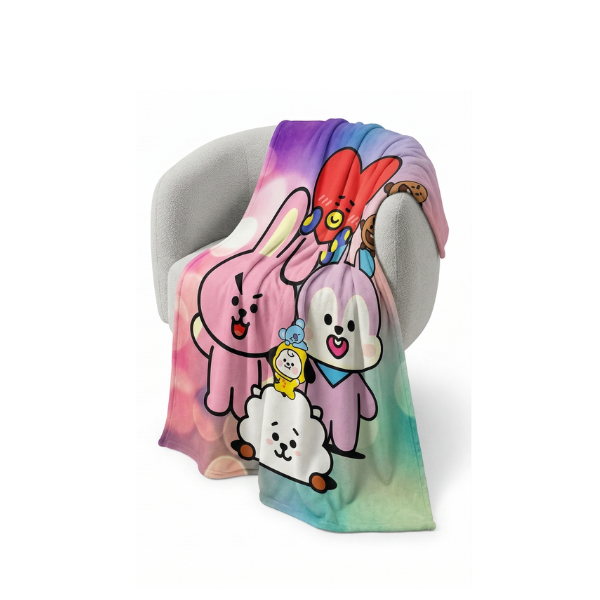 Duerme rodeada de magia y ternura. Esta cobija reúne a los personajes más queridos en un diseño de galaxia pastel que transformará tu habitación en un refugio Borahae. El abrazo perfecto para tus noches de descanso o maratón de contenido coreano.