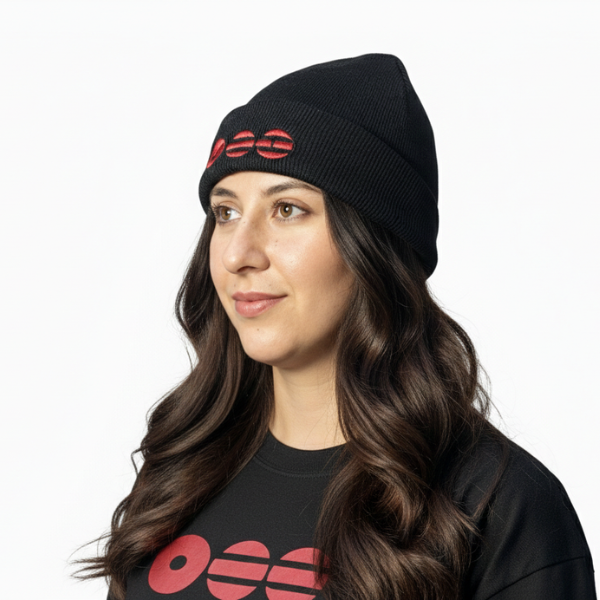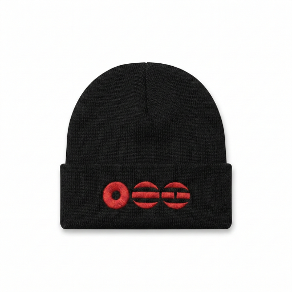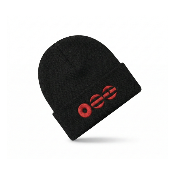 Accesorio de colección tipo beanie con bordado industrial del logo Arirang. Tejido térmico de alta calidad en color negro mate con detalles en rojo intenso. ¡Prepárate para la nueva gira!